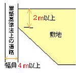 (※2)セットバックとは、土地に接する道路の巾が4mに満たない時に、道路の中心から2m後退して建物を建築することをいいます。下がった部分は道路として、建築物を建築できないのみでなく、門や塀や擁壁、花壇さえも建築することはできません。